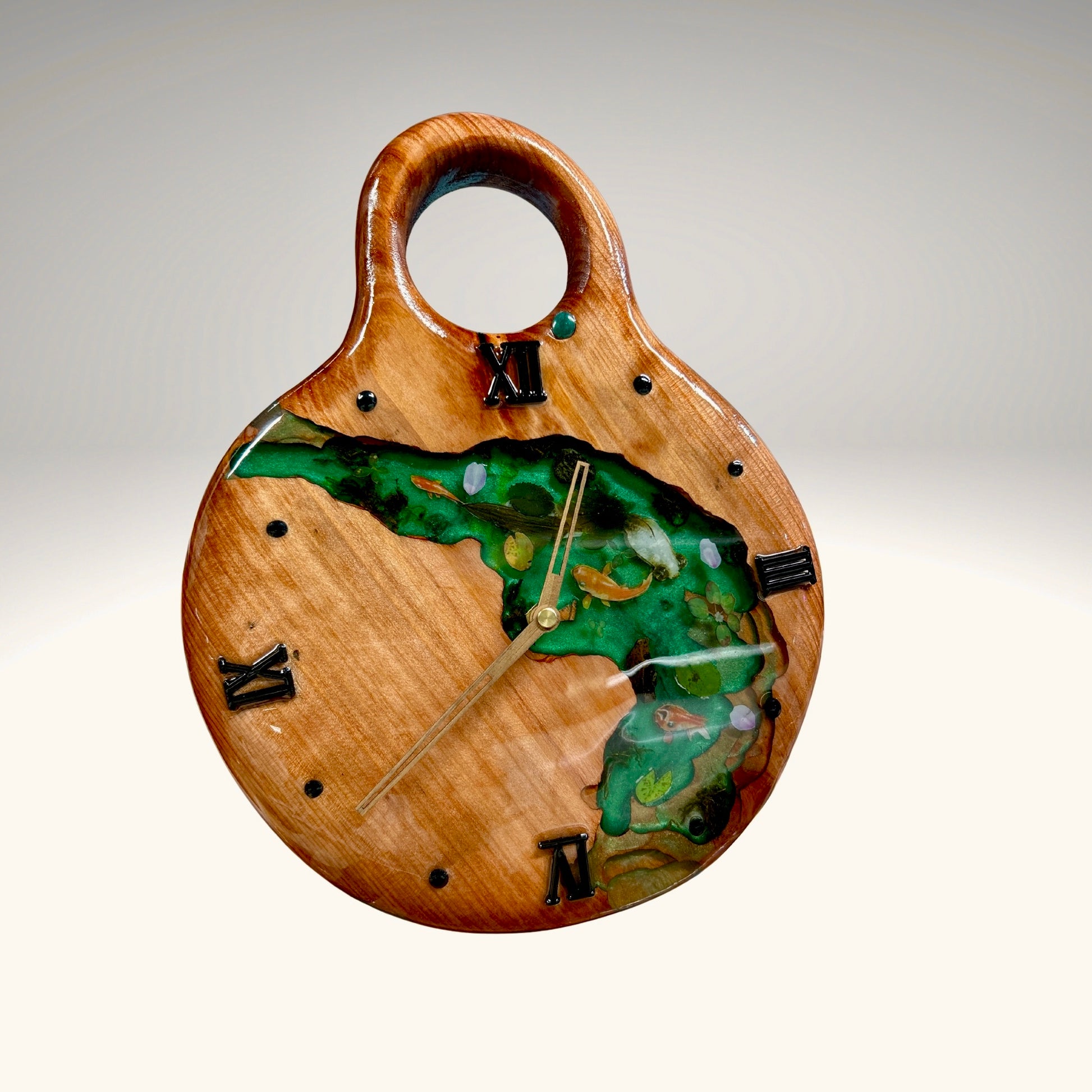 This handcrafted koi pond resin and wood wall clock is a one-of-a-kind functional art piece made from solid natural wood and deep green epoxy resin. The flowing koi pond river design features embedded koi fish and natural elements, creating stunning depth, movement, and a peaceful Zen-inspired look.
